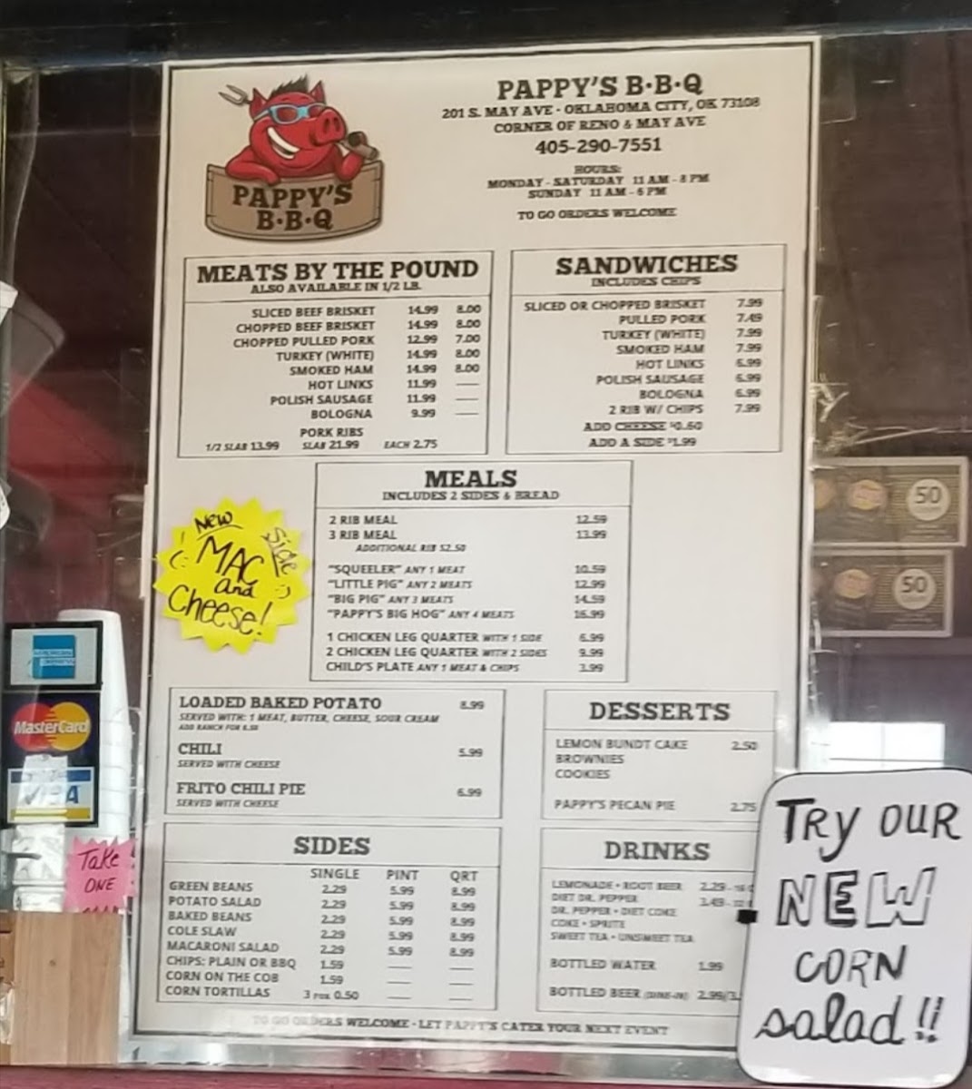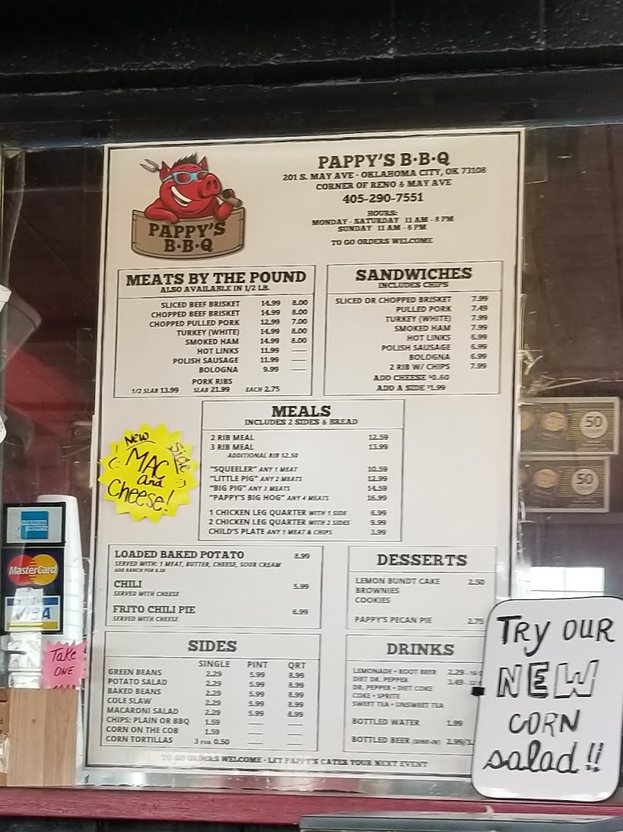 Welcome to Pappy's BBQ, a true culinary gem nestled in Oklahoma City at 201 S May Ave. As you step into this vibrant eatery, you're immediately drawn into the mouthwatering aroma of smoked meats and savory sides. The menu showcases a selection of classic BBQ options, such as their well-loved Squealer plate, which offers a choice of meats alongside delicious sides like baked beans and potato salad.